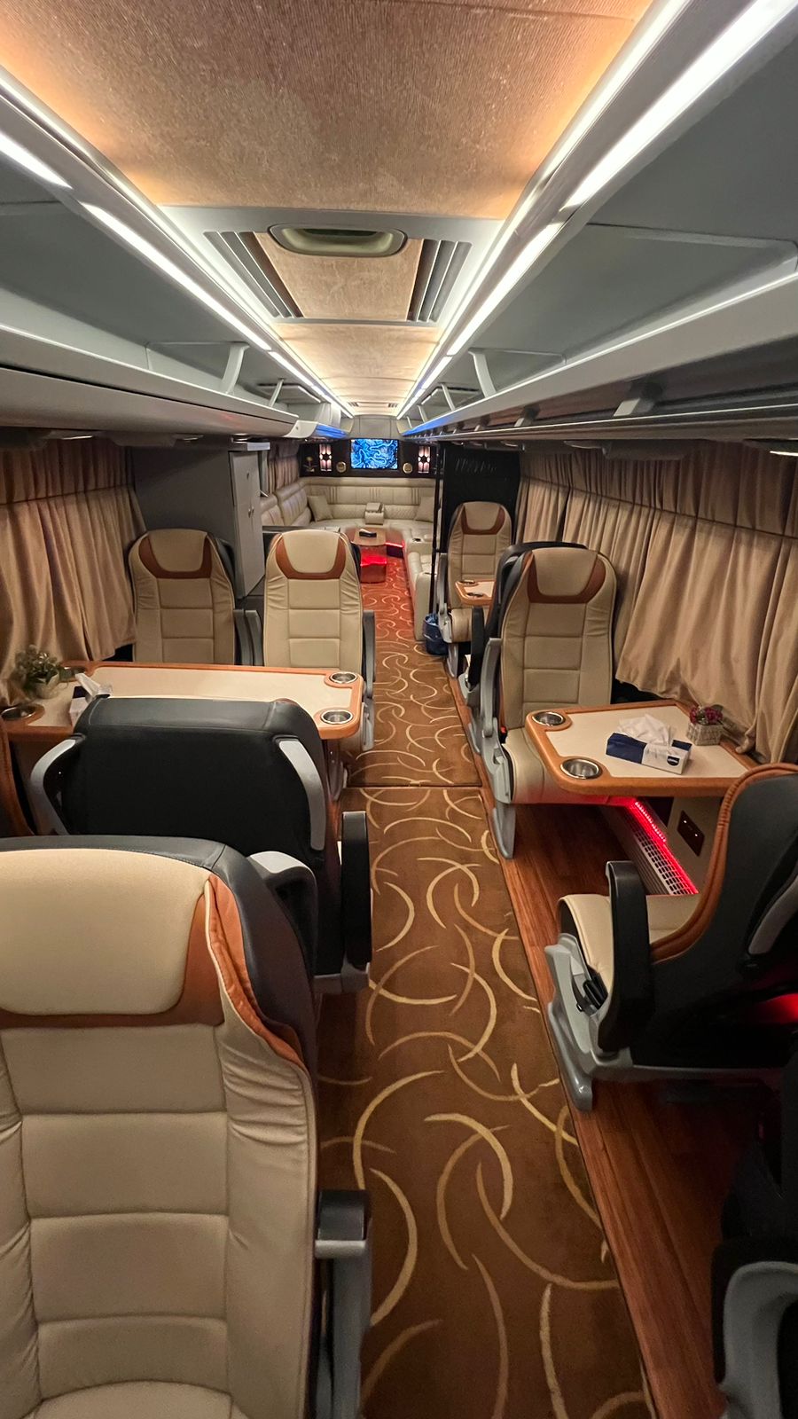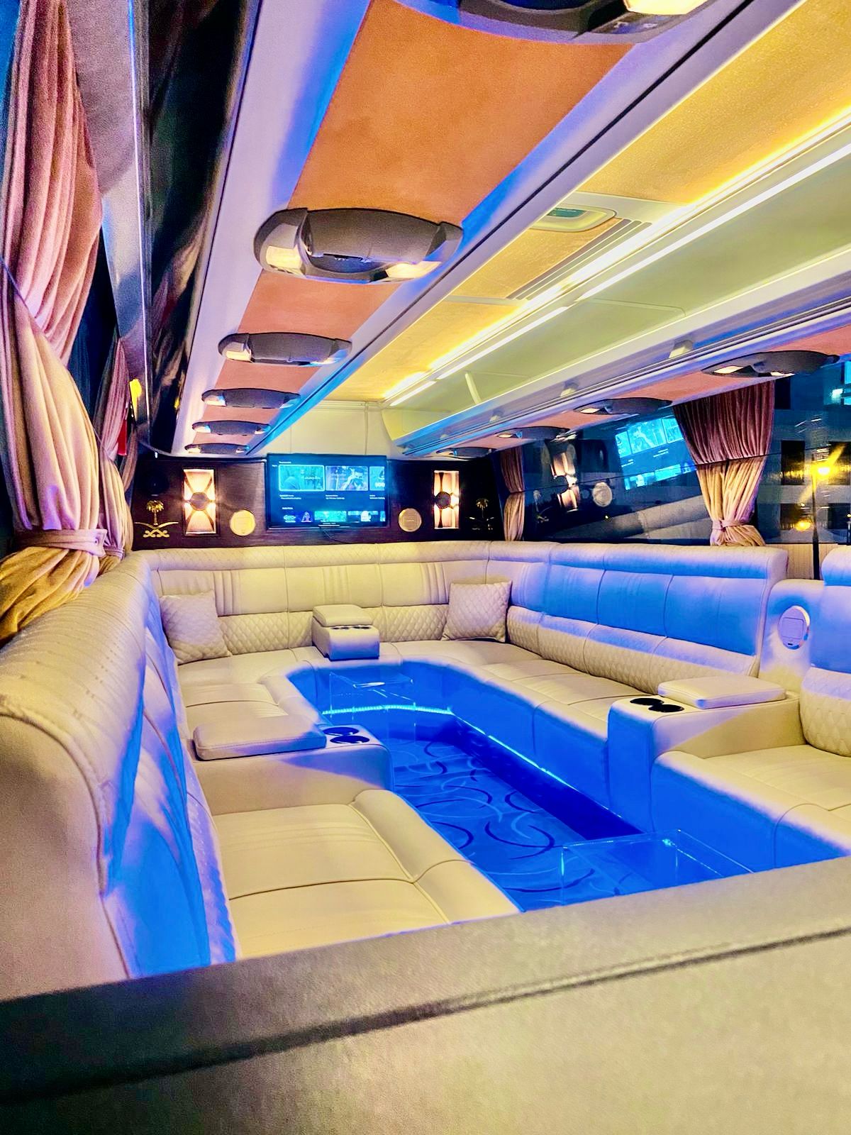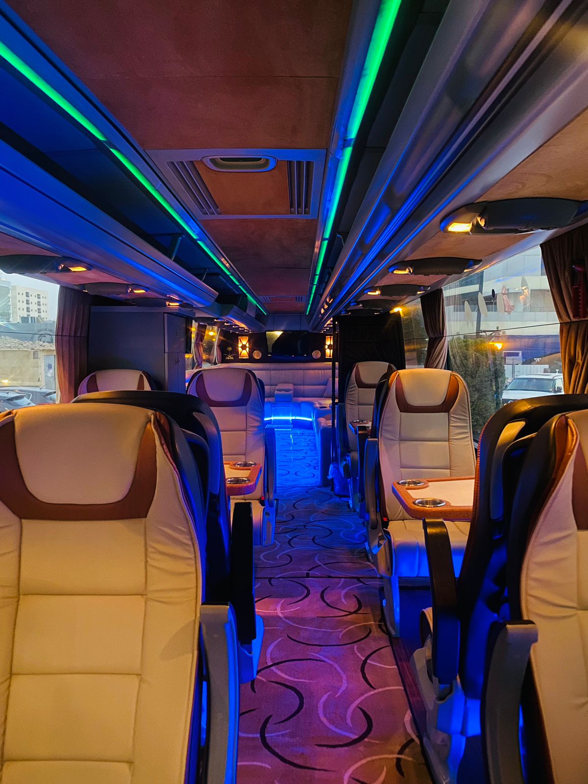 تتمتع حافلات الـVIP الملكية من نوع مرسيدس بمواصفات مميزة وفخامة لتجعل رحلتك بأعلى مستوى من الراحة حيث تحتوي المقصورة الأمامية على 11 مقعد جلد قابلة للطي مع طاولات لتكون انت وضيوفك متقابلين وتستمتع بالحديث وتقديم الضيافة ووضع المستلزمات والأجهزة على الطاولات.