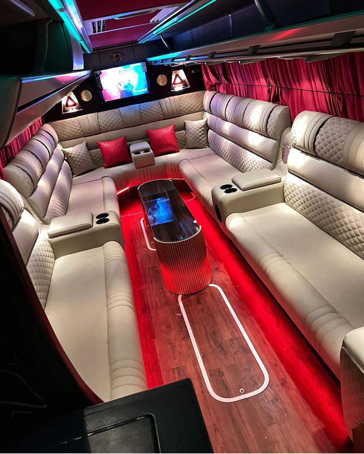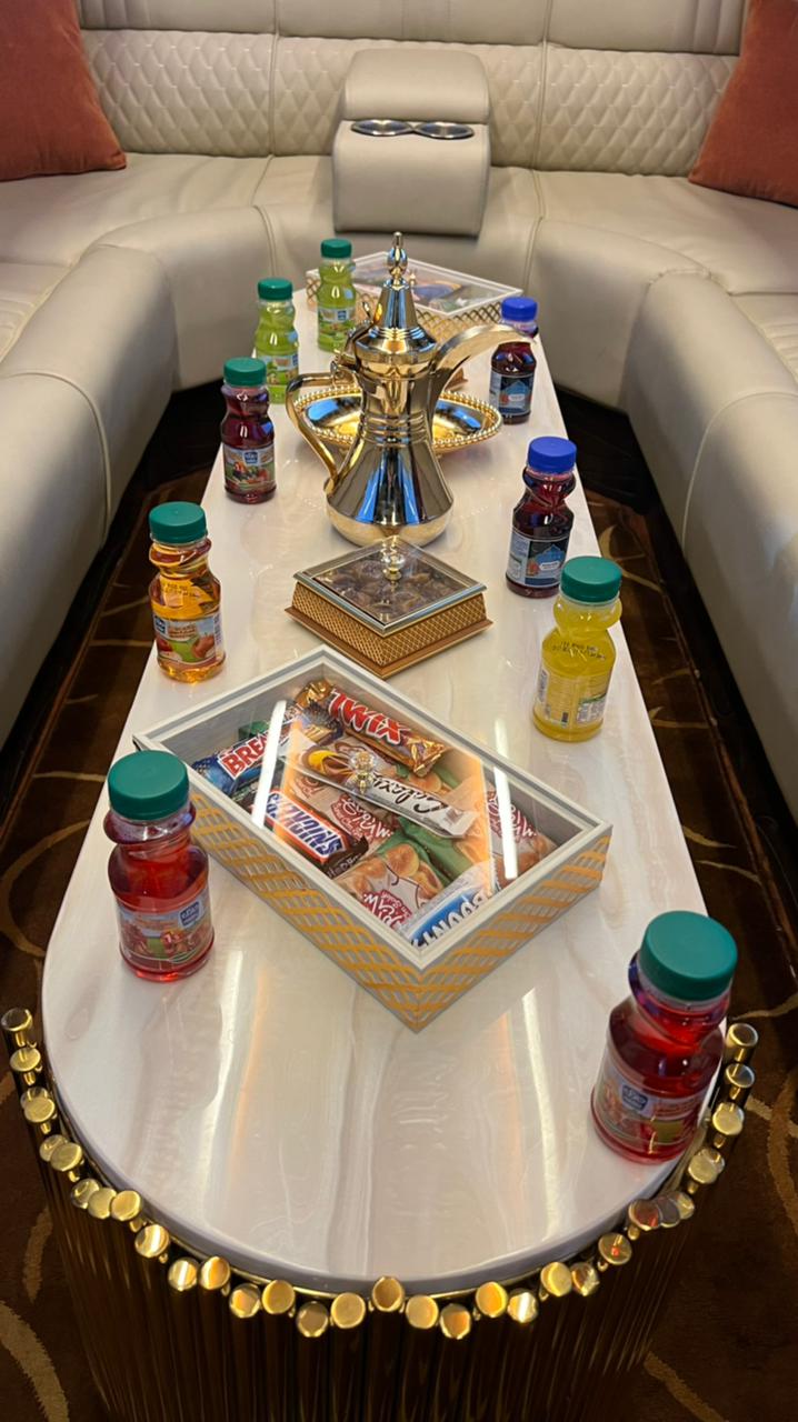 اما المقصورة الخلفية للحافلة فتحتوي على كنب متصل يتسع للـ14 راكب وامامهم طاولة ضيافة وشاشة سمارت في نهاية الجلسة.
